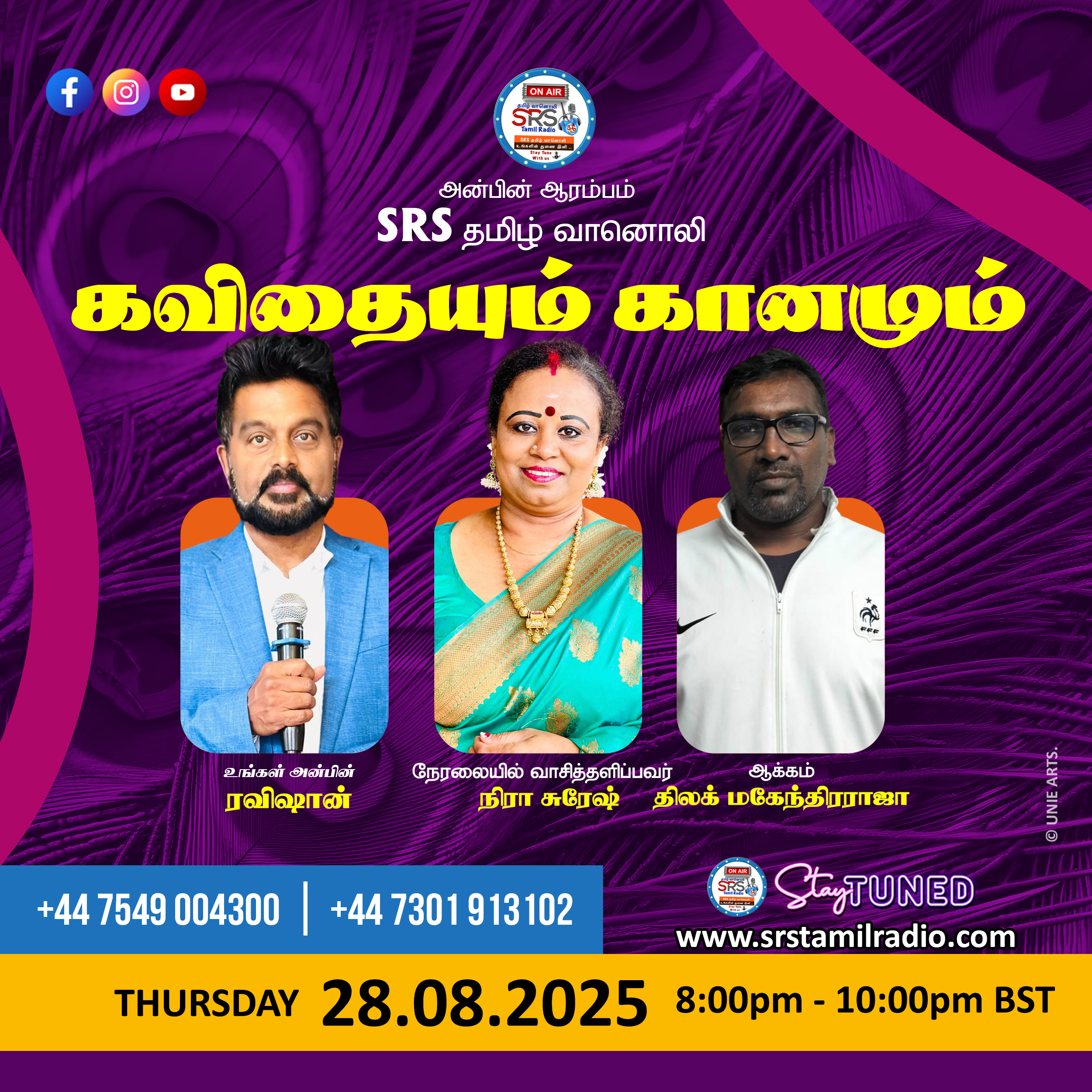 Live Shows கவிதையும் கானமும் நிகழ்ச்சி 28.08.25 கவிதையும் கானமும் நிகழ்ச்சி 28.08.25 August 28, 2025 / SRS admin / 0 Comments