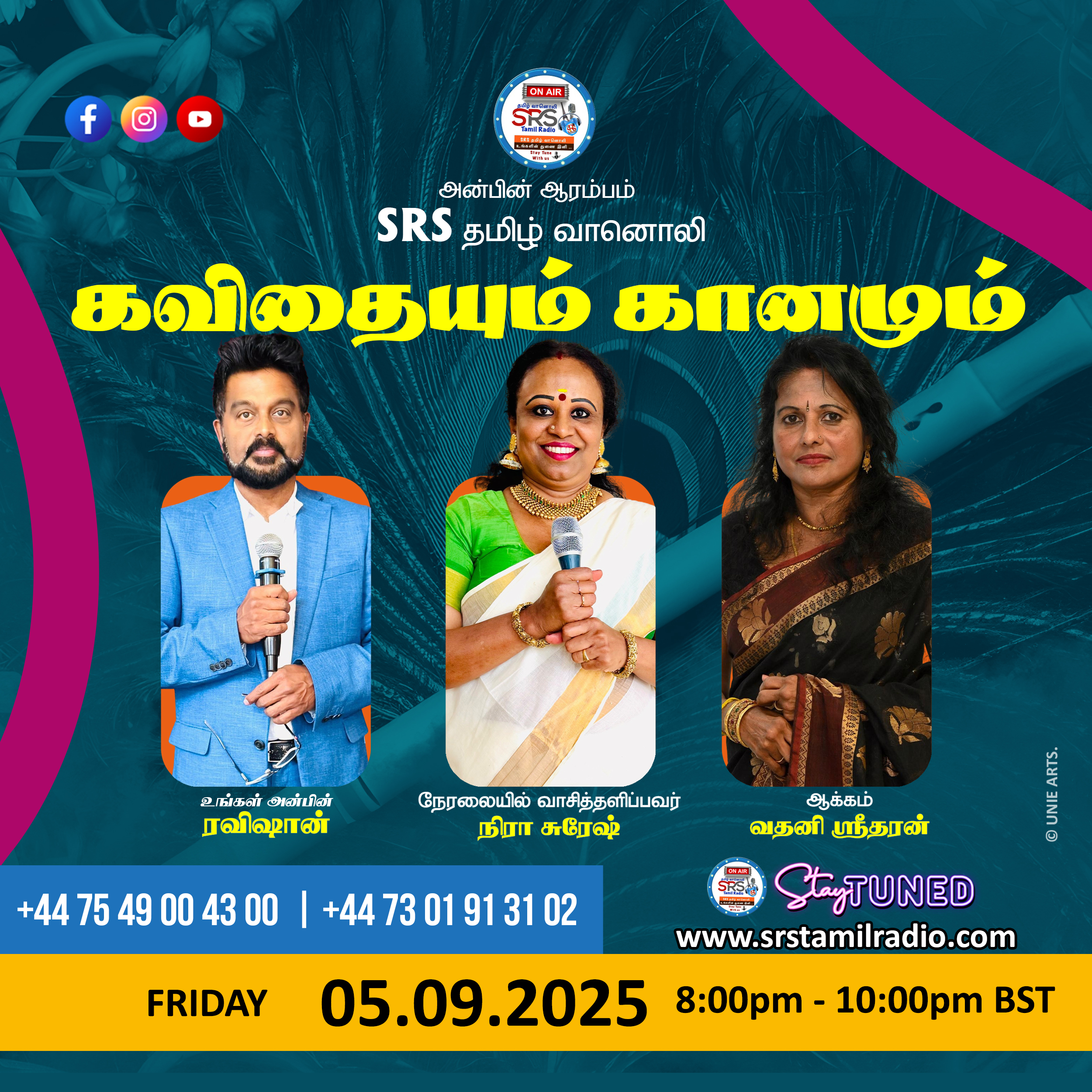 Live Shows கவிதையும் கானமும் நிகழ்ச்சி 05.09.25 கவிதையும் கானமும் நிகழ்ச்சி 05.09.25 September 3, 2025 / SRS admin / 0 Comments