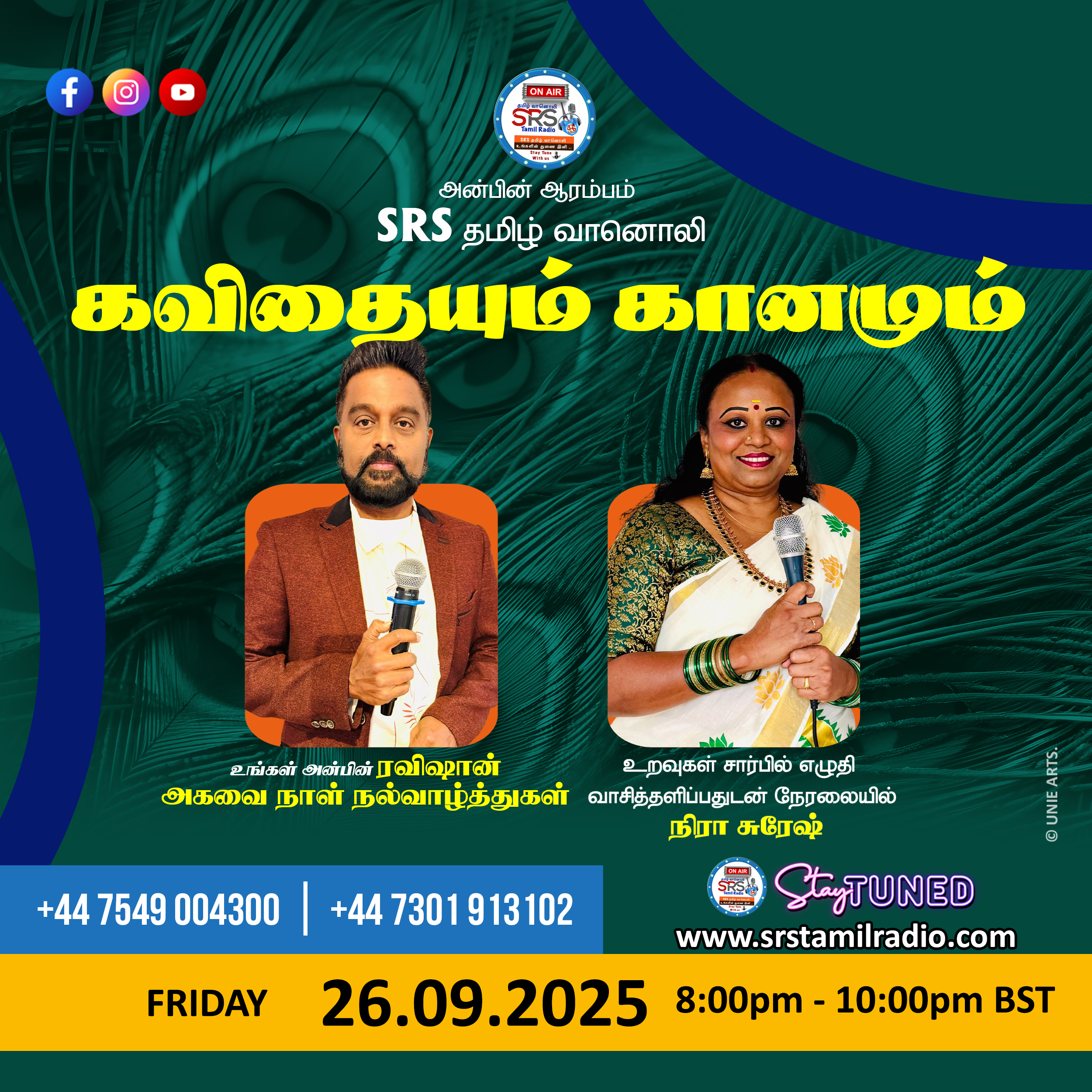 Live Shows சிறப்புக் கவிதையும் கானமும் 26.09.25 சிறப்புக் கவிதையும் கானமும் 26.09.25 September 23, 2025 / SRS admin / 0 Comments