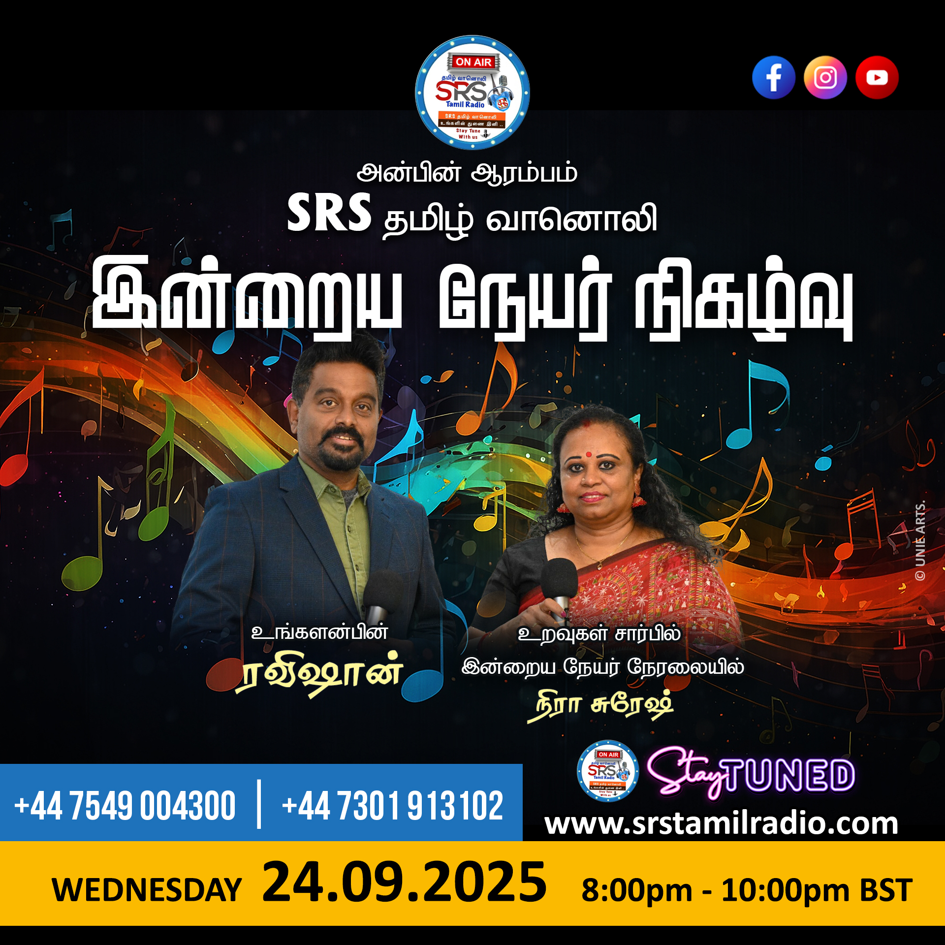 Live Shows இன்றைய நேயர் நிகழ்ச்சி 24.09.25 இன்றைய நேயர் நிகழ்ச்சி 24.09.25 September 23, 2025 / SRS admin / 0 Comments
