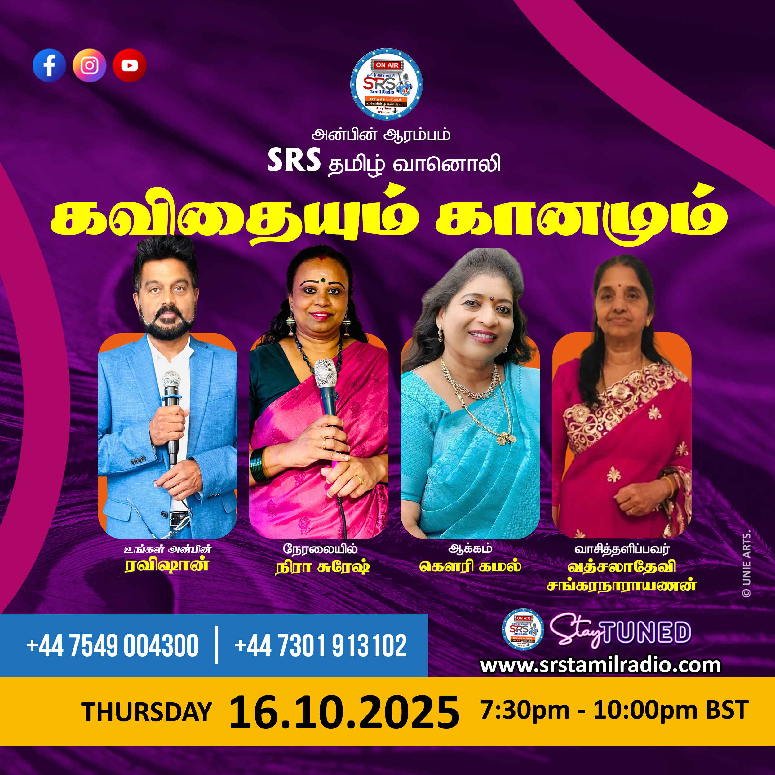 Live Shows கவிதையும் கானமும் நிகழ்ச்சி 16.10.25 கவிதையும் கானமும் நிகழ்ச்சி 16.10.25 October 13, 2025 / SRS admin / 0 Comments